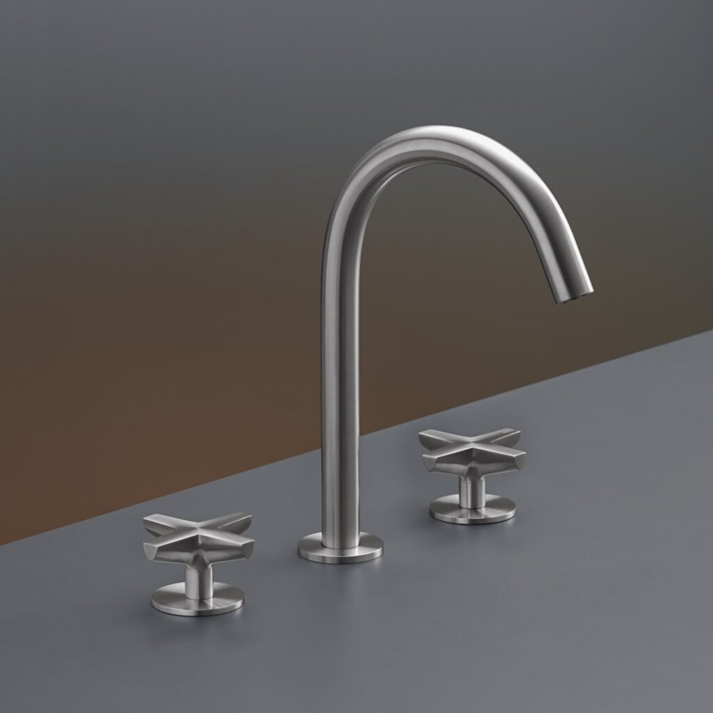A collection based on the cross model reinterpretation, from a tapered body arises a Greek cross handle, characterized by a flat front face that represent the “trait d’union” between the classical concept and the design contemporary representation. A faucet range in stainless steel AISI316L available with progressive, dual handle and thermostatic mixers